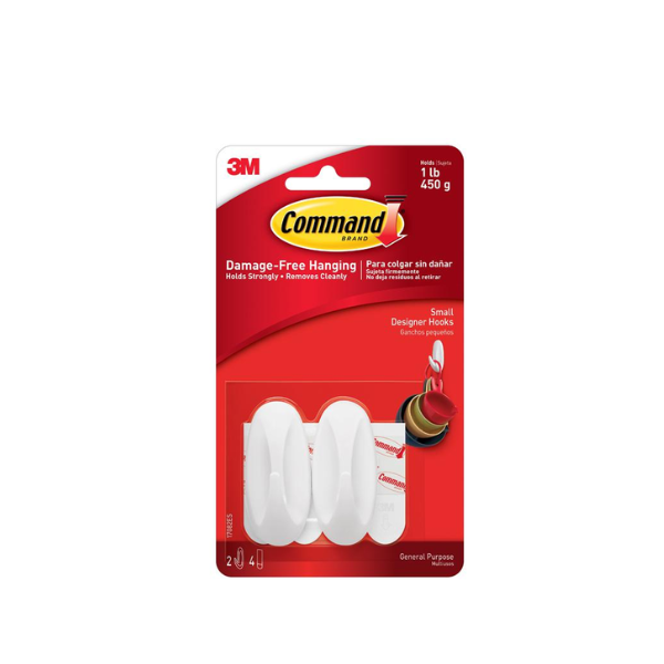 Command Small Designer Hooks can easily help you to organise your kitchen, home and office spaces with ease, no tools required! Easy to apply and remove. It is the perfect tool to help you hang all your clothes, utensils, bags, baking tools and decor items such as flower pots and more quickly and efficiently with the help of revolutionary Command™ Adhesive Strips”. Holds up to 450g.