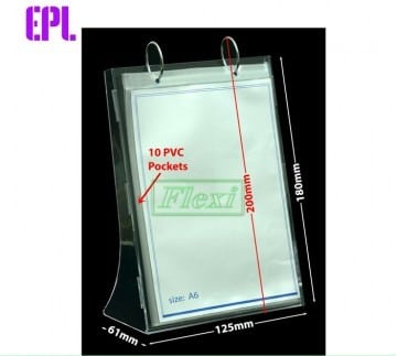 Our model is an A6-sized, portrait-oriented acrylic stand of superior quality. It includes 2 steel rings at its apex and accommodates 10 pockets for A6-sized clear protector sheets. Each pocket opens on the right side, allowing for easy insertion and flipping of information sheets. This stand is ideal for desktop, tabletop, and countertop displays.