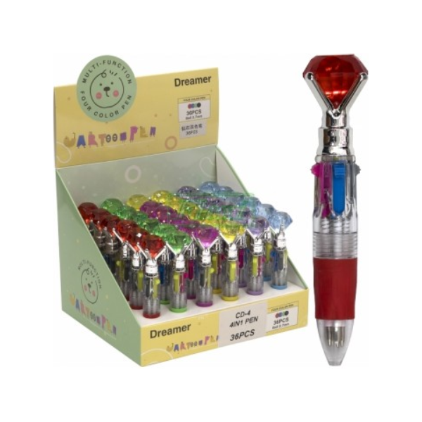 Our 4-colour ball pen, all-in-one with red, blue, green and black ink, with a 0.7mm for the pen tip. It is a very stylish ball pen that comes with a comfortable rubber-like pen grip. The pen body is made of transparent plastic and is nicely designed. There are 6 different colours for the pen body diamond head. The pen is retractable type.