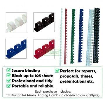 Our standard plastic binding combs, mainly used for binding A4 size (210mm x297mm) paper/document consisted of 21 plastic rings. They are made of good quality plastic, very durable and can be re-used. The binders can be open and close repeatedly without damage to it, allowing for pages of paper to be added or removed accordingly.