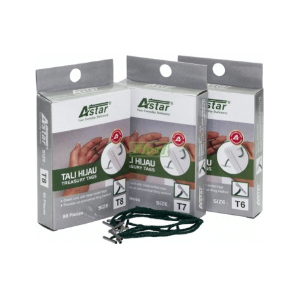 A typical green cotton file lace with both ends tagged with small metal cylindrical stick-like metal in the form of T-shape ending. This is used for filing thick stacks of paper of any size. There are 6 different length sizes to choose from, namely 5-10 inches long.