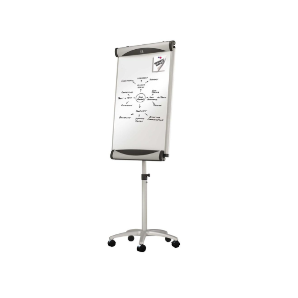 Stylish, durable and easy to use, Quartet’s Euro Premium Mobile Magnetic Easel is an excellent choice for boardrooms and school libraries. This easel features a magnetic porcelain-on-steel whiteboard that will not stain, ghost, scratch or dent and requires only minimal cleaning for heavy duty use. Adjust the easel height from 67″ to 77″ with ease. The contemporary matte aluminum frame features adjustable hooks and a clamp that holds flipcharts. Sits on a five-caster star base that prevents tipping and makes it a cinch to move.